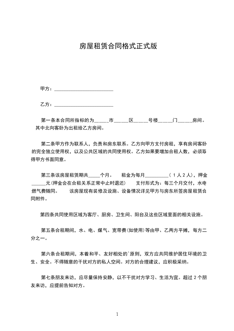 第三条该房屋租赁期共_____个月。 租金为每月__________(1人2人),押金______元(押金会在合租关系正常中止时退还) 支付形式为:每三个月交付,水电燃气费随同。 该房屋现有装修及设施、设备情况详见甲方与房东所签房屋租赁合同附件。