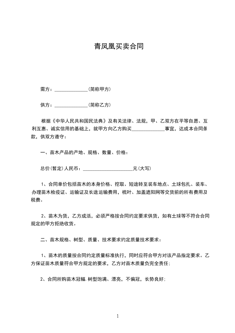 经甲乙双方友好协商,根据《中华人民共和国民法典》,就甲方购买工程所需苗木的具体事宜签订本合同,共同遵守。