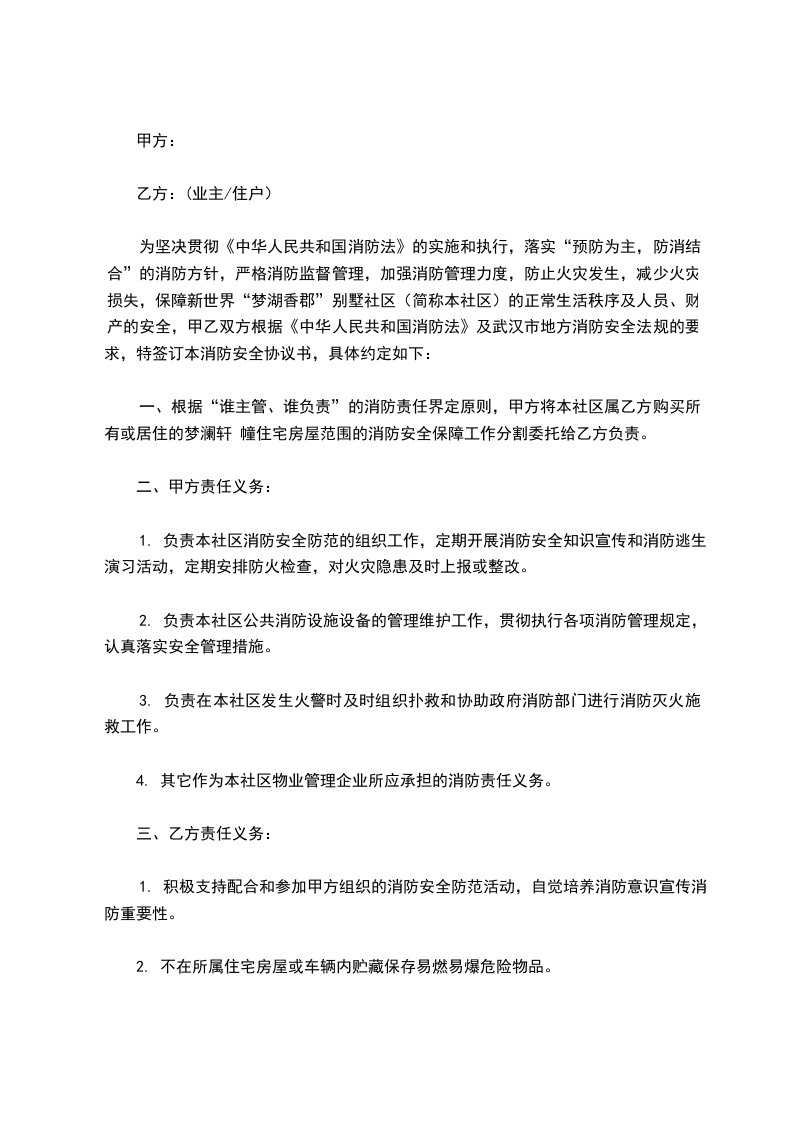 为坚决贯彻《中华人民共和国消防法》的实施和执行,落实“预防为主,防消结合”的消防方针,严格消防监督管理,加强消防管理力度,防止火灾发生,减少火灾损失,保障新世界“梦湖香郡”别墅社区(简称本社区)的正常生活秩序及人员、财产的安全,甲乙双方根据《中华人民共和国消防法》及武汉市地方消防安全法规的要求,特签订本消防安全协议书,具体约定如下: