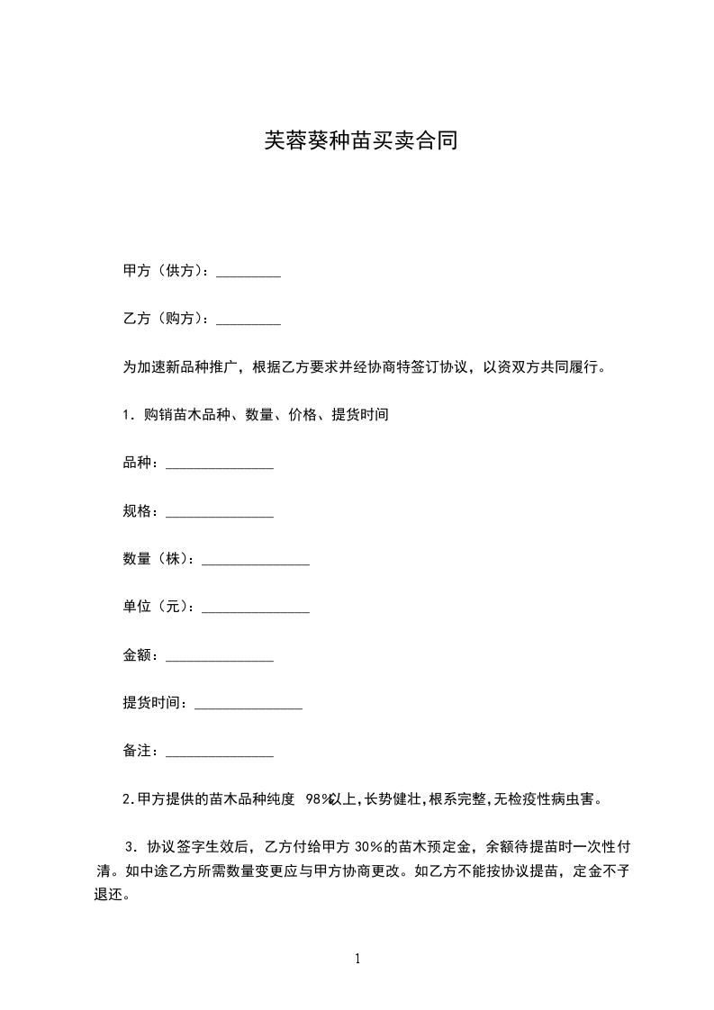 一、甲方向乙方采购苗木_______株,金额为人民币____________。甲方与乙方按实际采购苗木数量,按实结算。