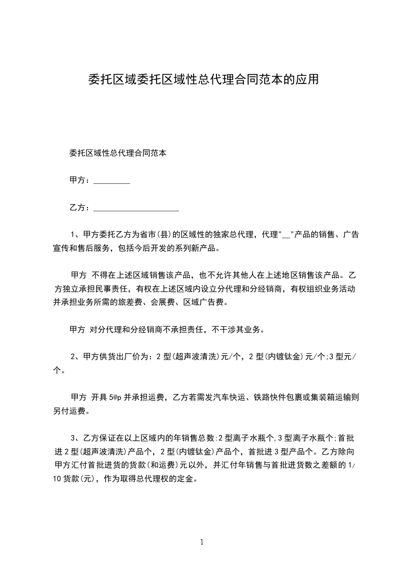 1、甲方委托乙方为 省 市(县)的区域性的独家总代理,代理"xx"产品的销售、广告宣传和售后服务,包括今后开发的系列新产品。甲方不得在上述区域销售该产品,也不允许其他人在上述地区销售该产品。乙方独立承担民事责任,有权在上述区域内设立分代理和分经销商,有权组织业务活动,并承担业务所需的旅差费、会展费、区域广告费。甲方对分代理和分经销商不承担责任,不干涉其业务。