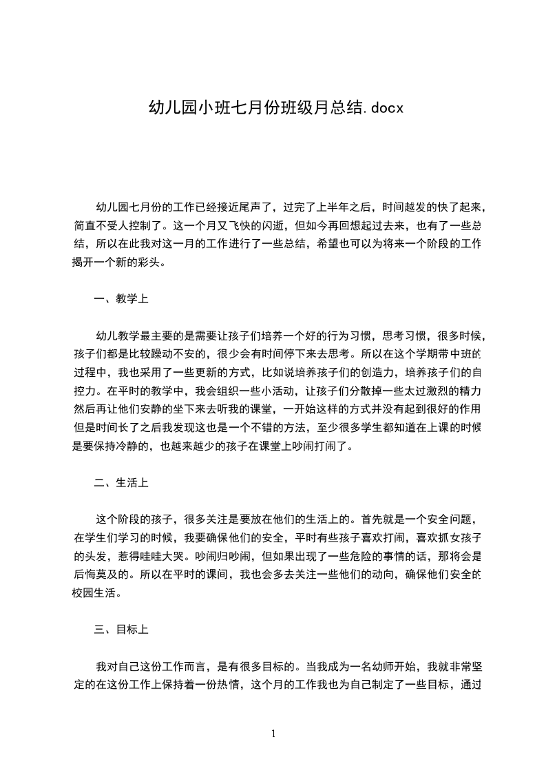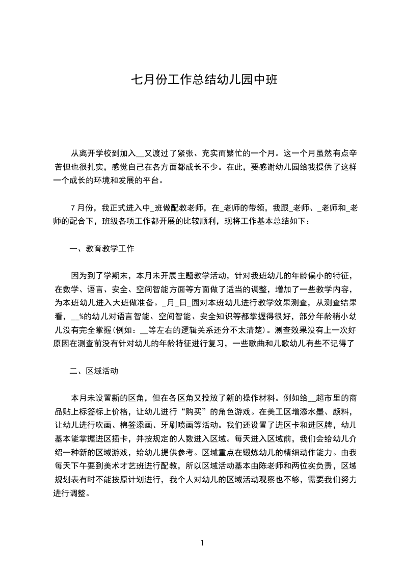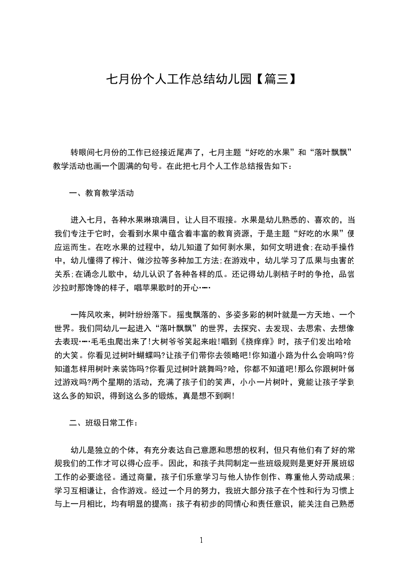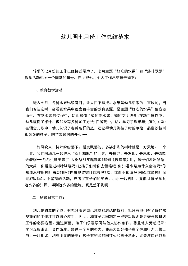 转眼间七月份的工作已经接近尾声了,七月主题“好吃的水果”和“落叶飘飘”教学活动也画一个圆满的句号。在此把七月个人工作总结报告如下:
