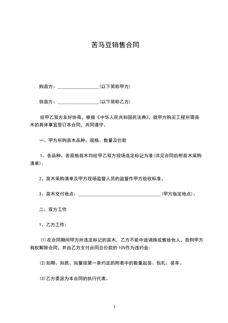 (1)在合同期间甲方所选定标记的苗木,乙方不能中途调换或售给他人,否则甲方有权解除合同,并由乙方支付合同总价款的10%作为违约金;