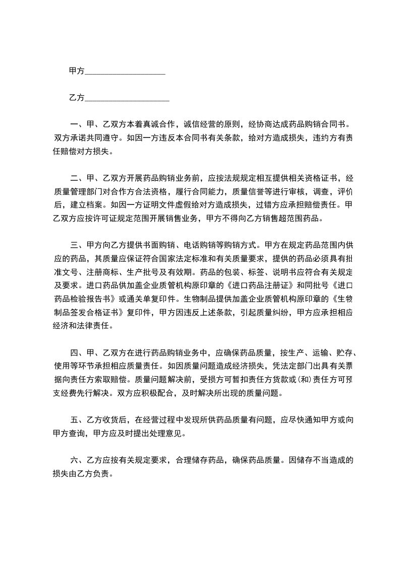 一、甲、乙双方本着真诚合作,诚信经营的原则,经协商达成药品购销合同书。双方承诺共同遵守。如因一方违反本合同书有关条款,给对方造成损失,违约方有责任赔偿对方损失。