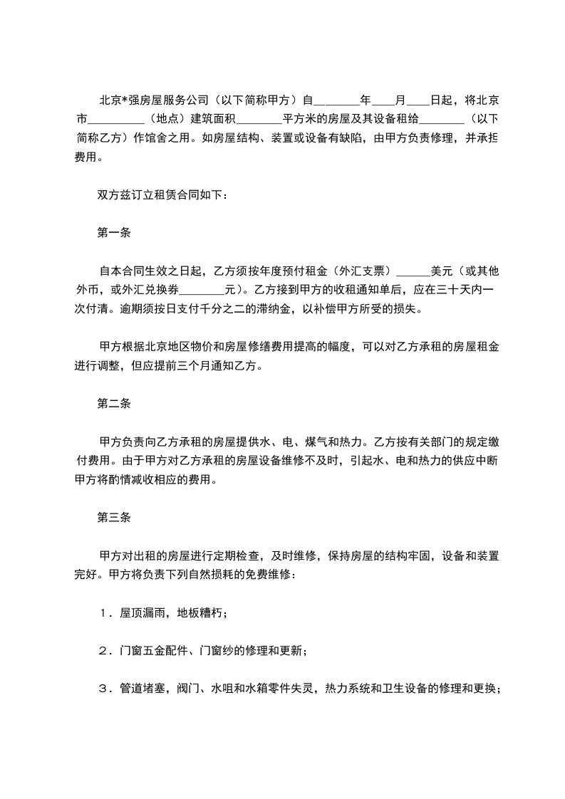 北京*强房屋服务公司(以下简称甲方)自____年__月__日起,将北京市_____(地点)建筑面积____平方米的房屋及其设备租给____(以下简称乙方)作馆舍之用。如房屋结构、装置或设备有缺陷,由甲方负责修理,并承担费用。