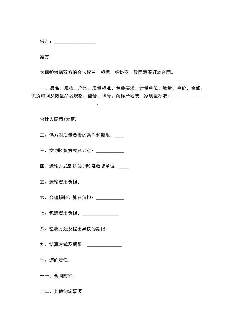 一、品名、规格、产地、质量标准、包装要求、计量单位、数量、单价、金额、供货时间及数量品名规格、型号、牌号、商标产地或厂家质量标准:__________________________________________。
