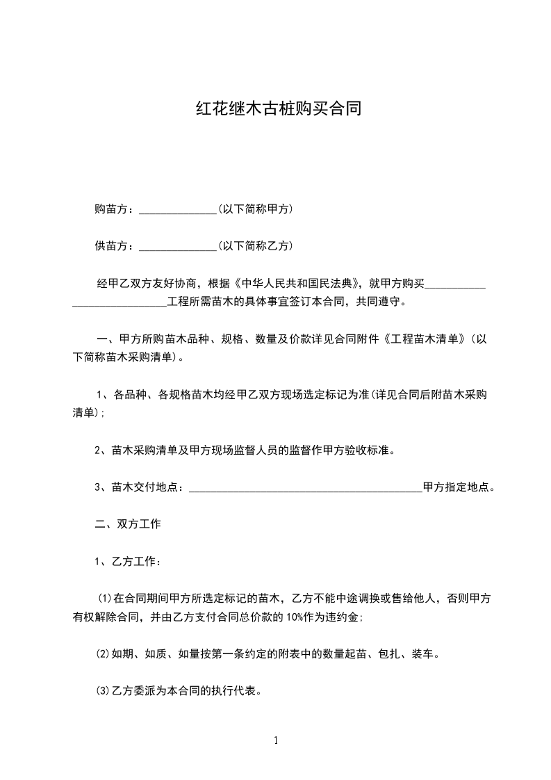 经甲乙双方友好协商,根据《中华人民共和国民法典》,就甲方购买____________________________工程所需苗木的具体事宜签订本合同,共同遵守。