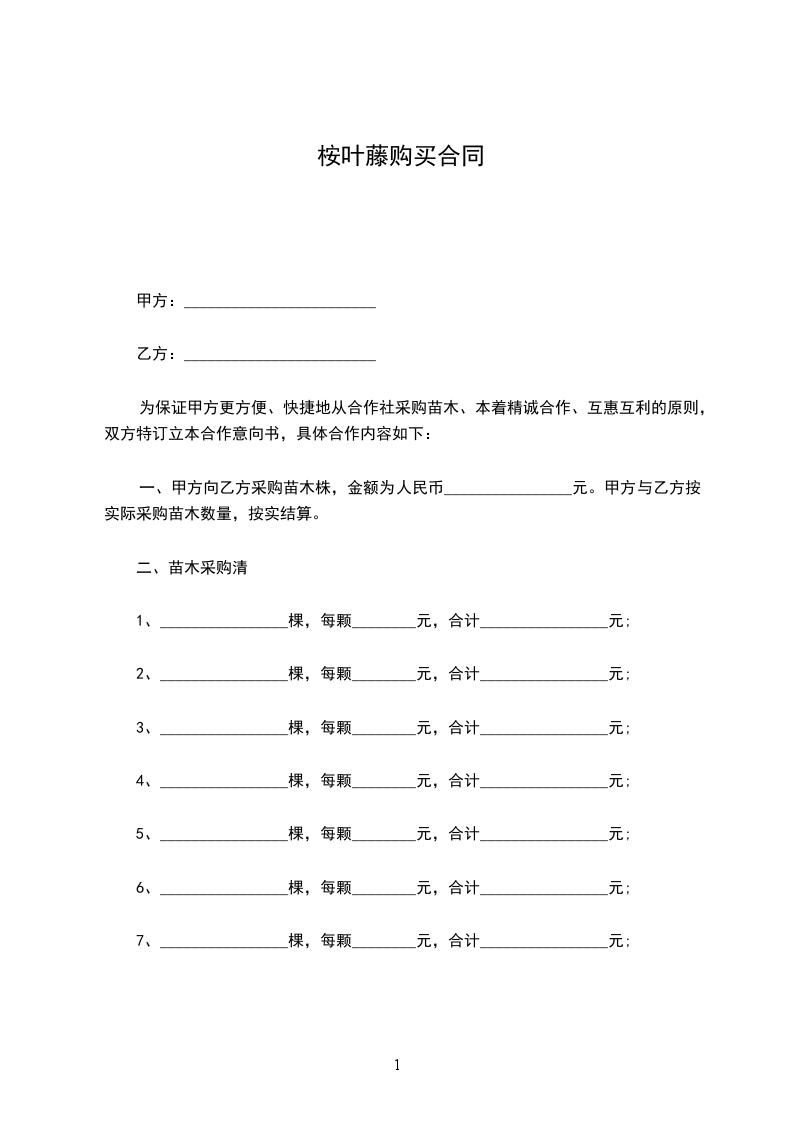 一、甲方向乙方采购苗木株,金额为人民币________________元。甲方与乙方按实际采购苗木数量,按实结算。