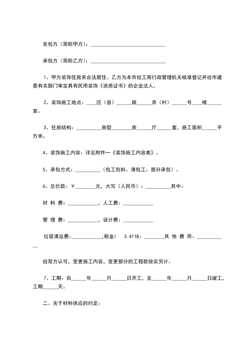 5、承包方式:_____(包工包料、清包工、部分承包)。