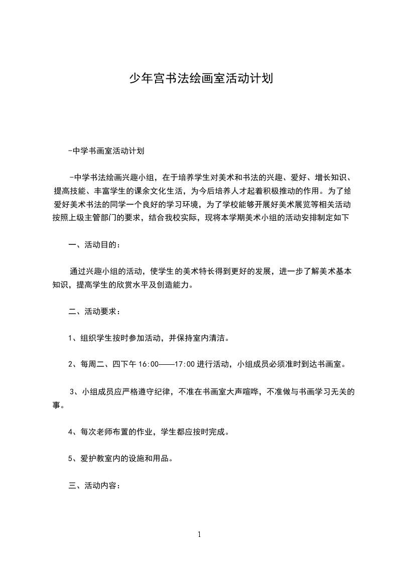 学校的艺术教育指导思想,从培养学生的兴趣出发。紧紧围绕“让艺术走近校园,走近班级,走近每一个学生”的主题活动,面向全体学生的广泛参与和普及面,动员和吸引广大学生积极参与到艺术节活动中来,努力让每一个学生都能享受到艺术的快乐。本小组在活动中一定要从培养学生兴趣的角度出发,紧密结合艺术教学的实际情况及学生的实际水平和接受程度,开展切实可行的美术技法技能训练活动,充分发掘和调动学生的积极性和创造性,认真组织,精心设计、服务教学,注重过程,通过美术小组的活动,使学生的美术特长得到更好的发展,进一步了解国画的基本知识、基本技能,提高学生的绘画能力及欣赏水平。特制定少年宫美术小组活动计划如下:
