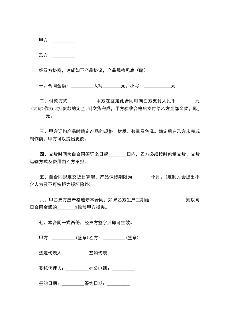 1、乙方供货无误的前提下,如甲方中途退货或使用其他同类产品,甲方应赔偿本合同金额_______________元给乙方作为违约金。