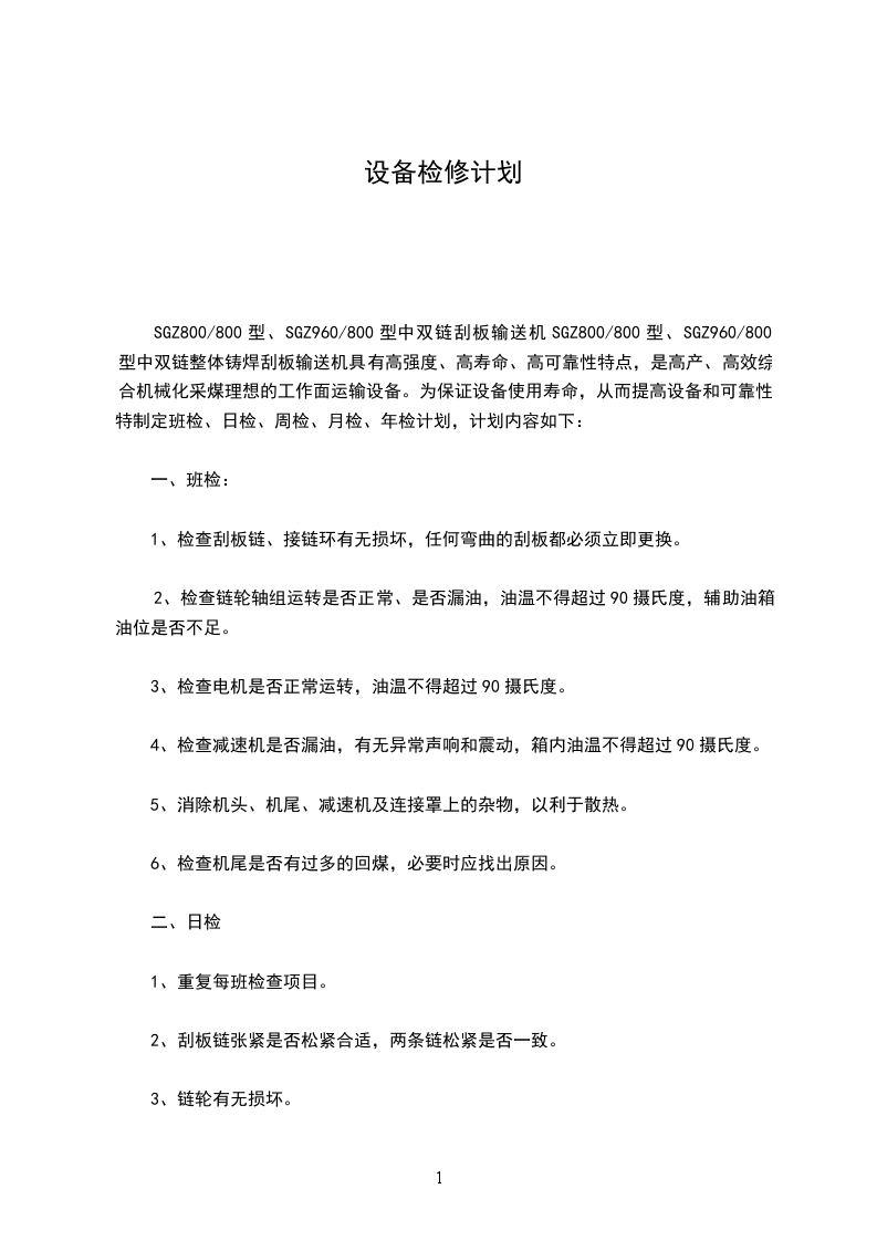 SGZ800/800型、SGZ960/800型中双链刮板输送机SGZ800/800型、SGZ960/800型中双链整体铸焊刮板输送机具有高强度、高寿命、高可靠性特点,是高产、高效综合机械化采煤理想的工作面运输设备。为保证设备使用寿命,从而提高设备和可靠性,特制定班检、日检、周检、月检、年检计划,计划内容如下: