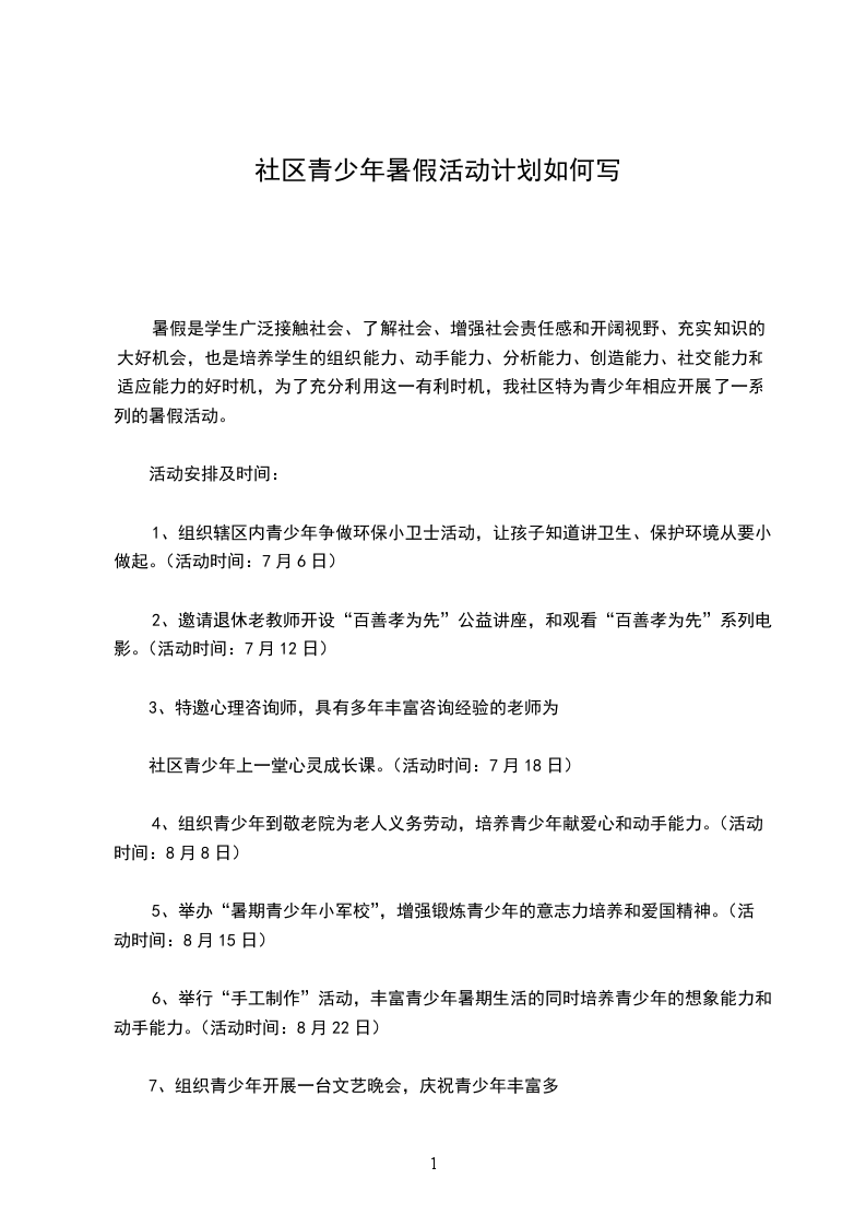 暑假是学生广泛接触社会、了解社会、增强社会责任感和开阔视野、充实知识的大好机会,也是培养学生的组织能力、动手能力、分析能力、创造能力、社交能力和适应能力的好时机,为了充分利用这一有利时机,我社区特为青少年相应开展了一系列的暑假活动。