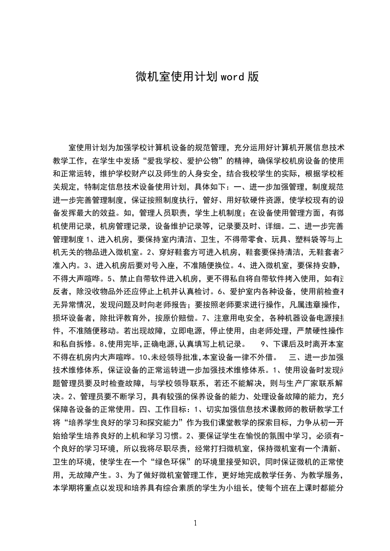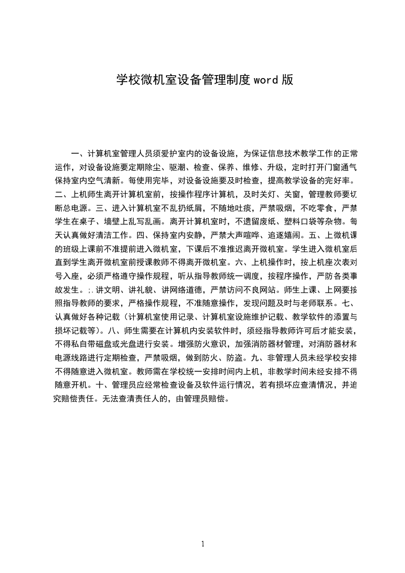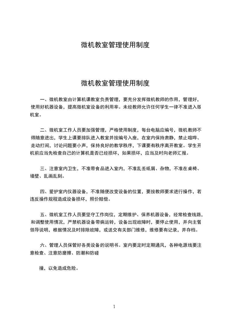一、微机教室由计算机课教室负责管理,要充分发挥微机教师的作用,管理好,使用好机器设备,提高微机室设备的利用率。未经教师允许任何学生一律不准进入微机室。