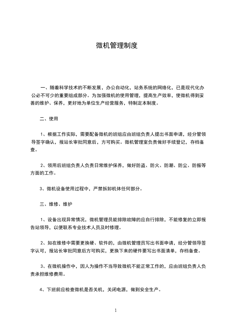 五、微机室工作人员要坚守工作岗位,定期维护、保养机器设备,经常检查线路,和调整使用情况,严禁机器设备带病运转,设备出现故障时,要停止使用,并向主管领导说明,根据情况及时排除故障,或送交有关部门维修,维修要有记录,并存档。