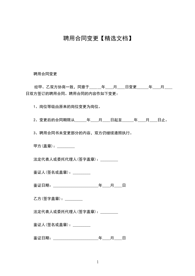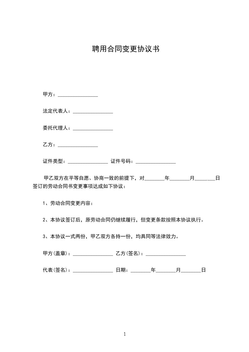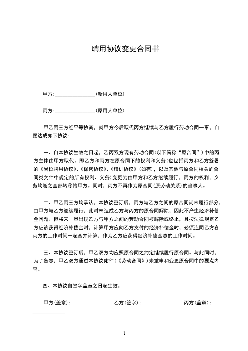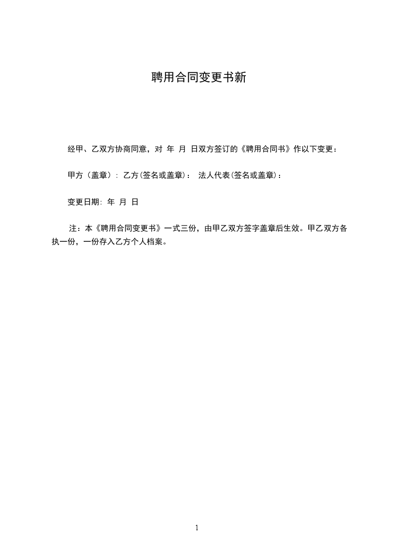 注:本《聘用合同变更书》一式三份,由甲乙双方签字盖章后生效。甲乙双方各执一份,一份存入乙方个人档案。