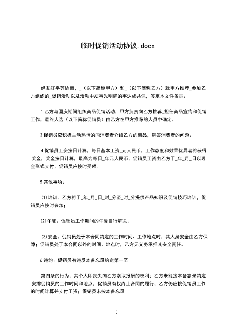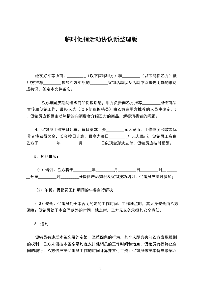 4.促销员工资按日计算,每日基本工资_________元人民币,工作态度和效果优异者将获得奖金,奖金按日计算,最高为每日_________年元人民币,促销员工资由乙方于_________年_________月_________日以现金形式支付,促销员应按时受领。
