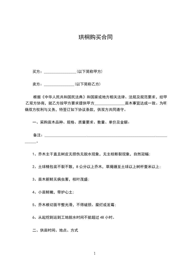 根据《中华人民共和国民法典》和国家或地方相关法律、法规及规范要求,经甲乙双方协商,就乙方按甲方要求提供甲方________________苗木事宜达成一致。为明确双方权利与义务,特签订如下协议条款,供双方共同遵守。