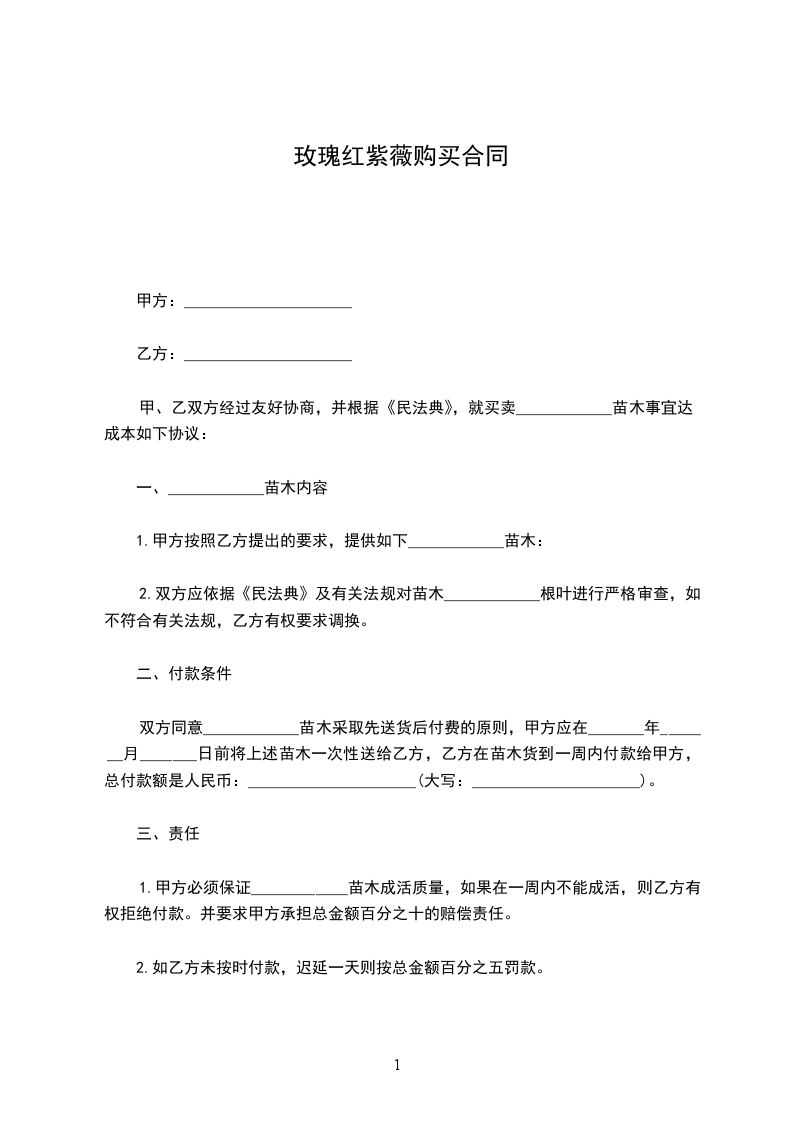 一、甲方向乙方采购苗木株,金额为人民币________________元。甲方与乙方按实际采购苗木数量,按实结算。