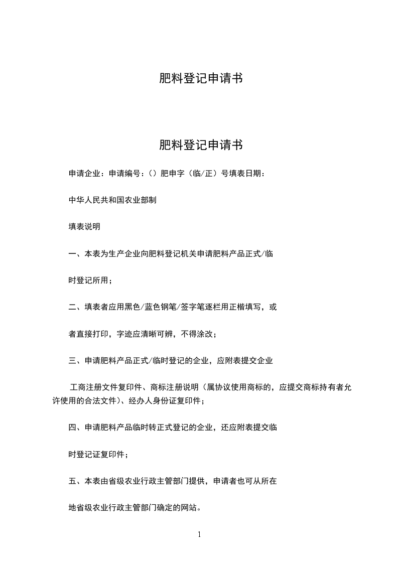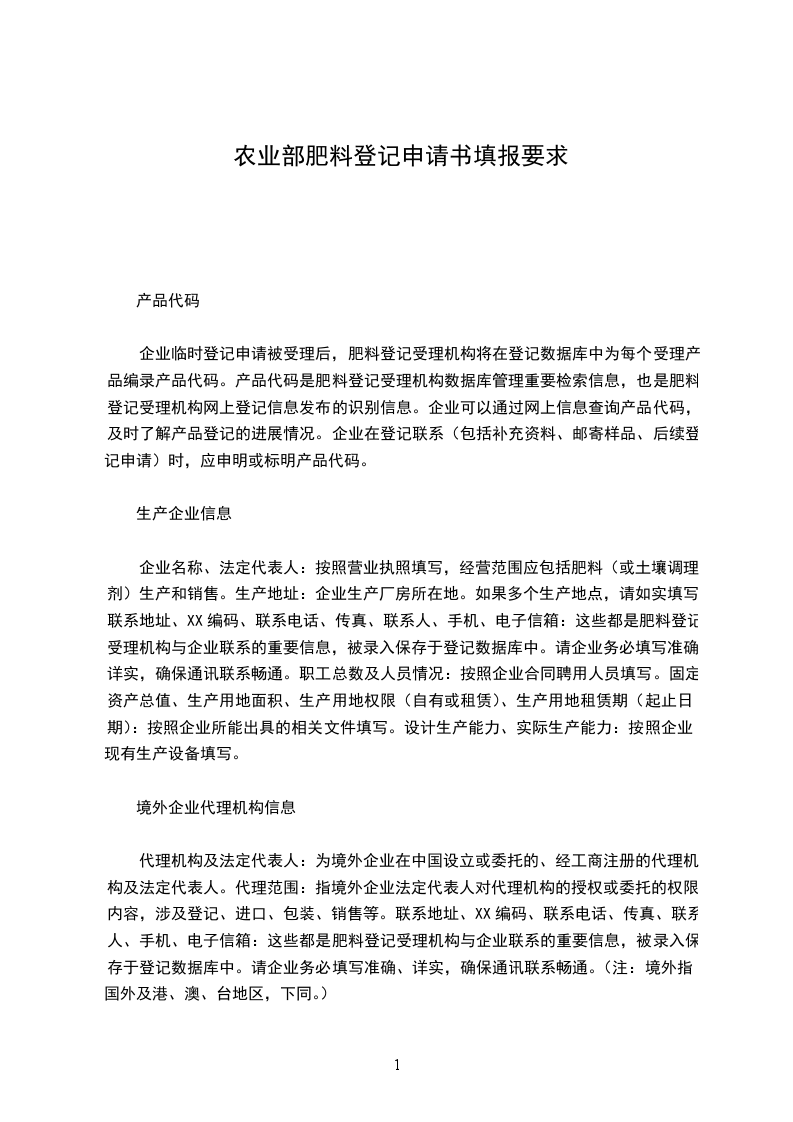 产品通用名称:请按照农业部“肥料登记目录及通用名称要求”填写,目录未列出的请空缺。产品商品名称:请按照农业部“肥料登记商品名称限用词库”填写,没有商品名称的请空缺。执行标准:请选择“执行强制性标准”或“执行企业标准”,若选择执行强制性标准,请注明标准号。产品形态:请选择“水剂”,或“粉剂”,或“颗粒”,或“其它”,若选择其它,请注明形态。产品外观:请详细描述产品的颜色或杂色、均匀度、杂质等外观。技术要求:请按产品所含成分如实填写。土壤调理剂产品技术要求仅在土壤调理剂和有机成分栏中填写。申请书中未列出的,请在空栏中填写。注意水剂产品应按法定计量单位g/L的值填写。境外产品在生产国或地区获准登记许可的时间:请如实填写。产品在其他国家或地区获准登记许可的情况:指境内企业和境外企业在非生产国或地区获准登记许可的情况。