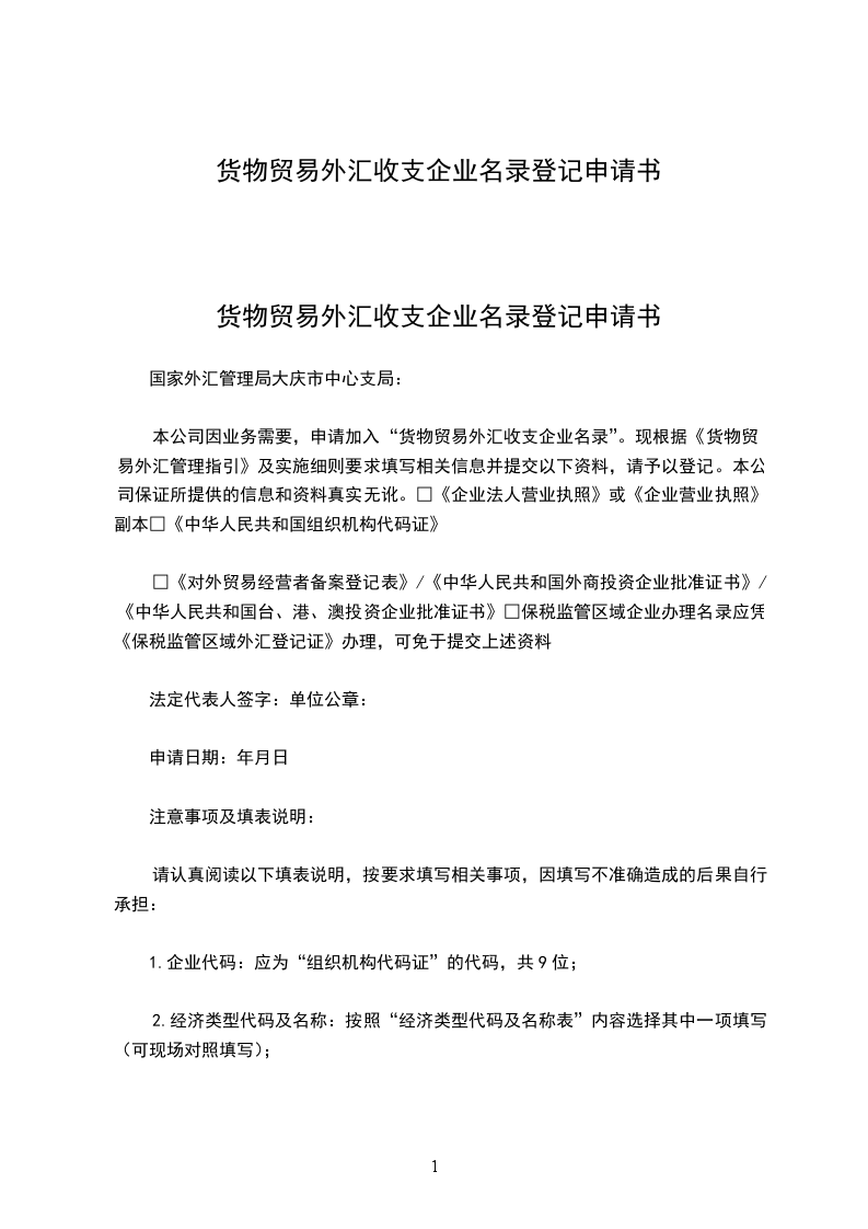本公司因业务需要,申请加入“货物贸易外汇收支企业名录”。现根据《货物贸易外汇管理指引》及实施细则要求填写相关信息并提交以下资料,请予以登记。本公司保证所提供的信息和资料真实无讹。□《企业法人营业执照》或《企业营业执照》副本□《中华人民共和国组织机构代码证》