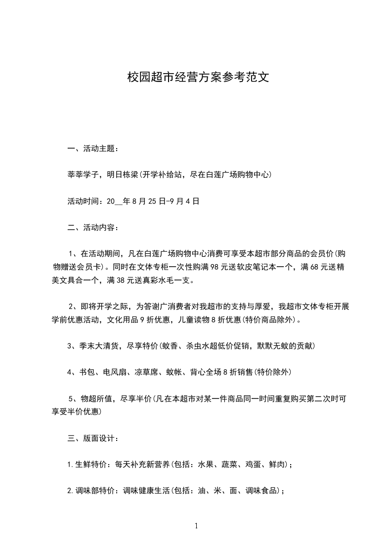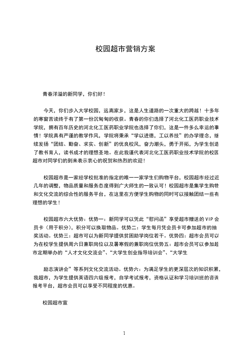 校园超市六大优势:优势一:新同学可以凭此“慰问函”享受超市赠送的VIP会员卡(用于积分),积分可以换取物品。优势二:学生每月凭会员卡可参加超市的抽奖活动。优势三:超市可以为新同学提供贫困助学岗位若干。优势四:超市会员可以为在校学生提供周六日兼职岗位以及暑寒假的兼职岗位优势五:超市会员可以参加超市定期举办的“人才文化交流会”、“大学生创业指导培训会”、“大学生
