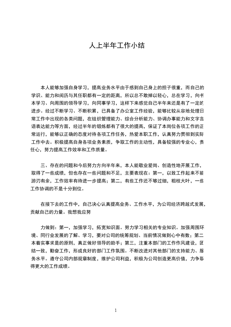 三、存在的问题和今后努力方向半年来,本人能敬业爱岗、创造性地开展工作,取得了一些成绩,但也存在一些问题和不足,主要表现在:第一,以致工作起来不能游刃有余,工作效率有待进一步提高;第二,有些工作还不够过细,粗枝大叶,一些工作协调的不是十分到位。