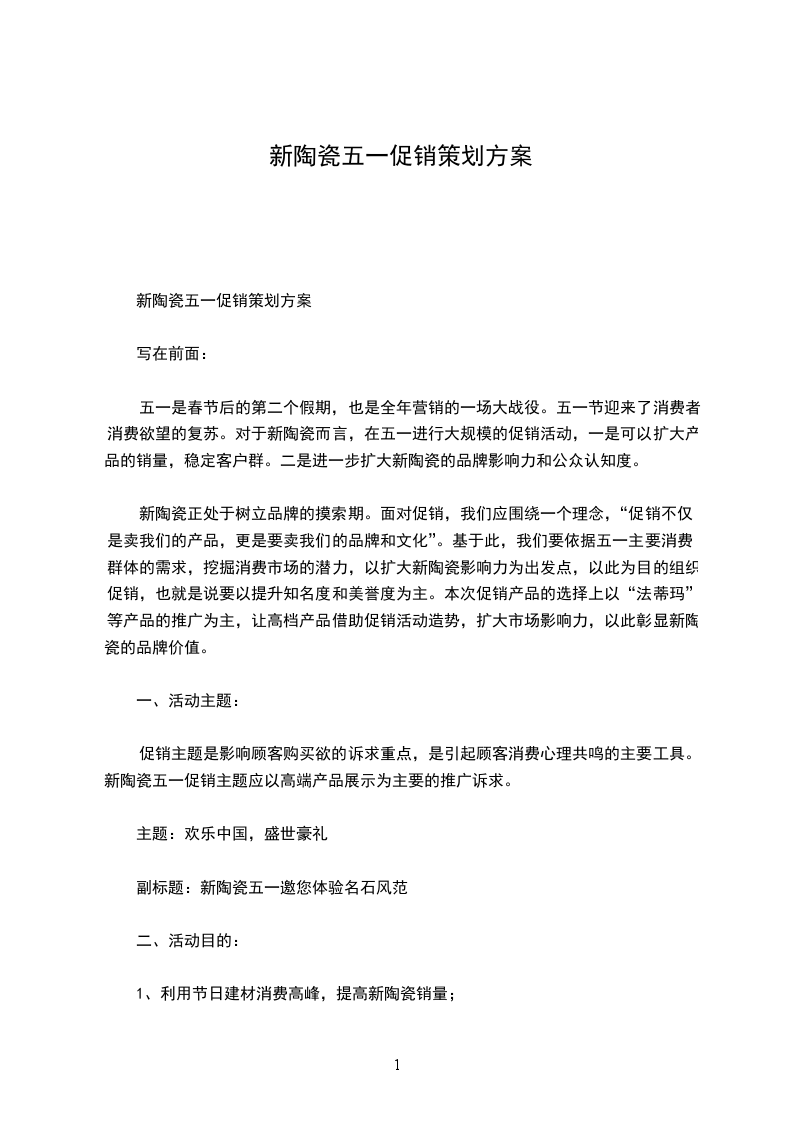 五一是春节后的第二个假期,也是全年营销的一场大战役。五一节迎来了消费者消费欲望的复苏。对于新陶瓷而言,在五一进行大规模的促销活动,一是可以扩大产品的销量,稳定客户群。二是进一步扩大新陶瓷的品牌影响力和公众认知度。
