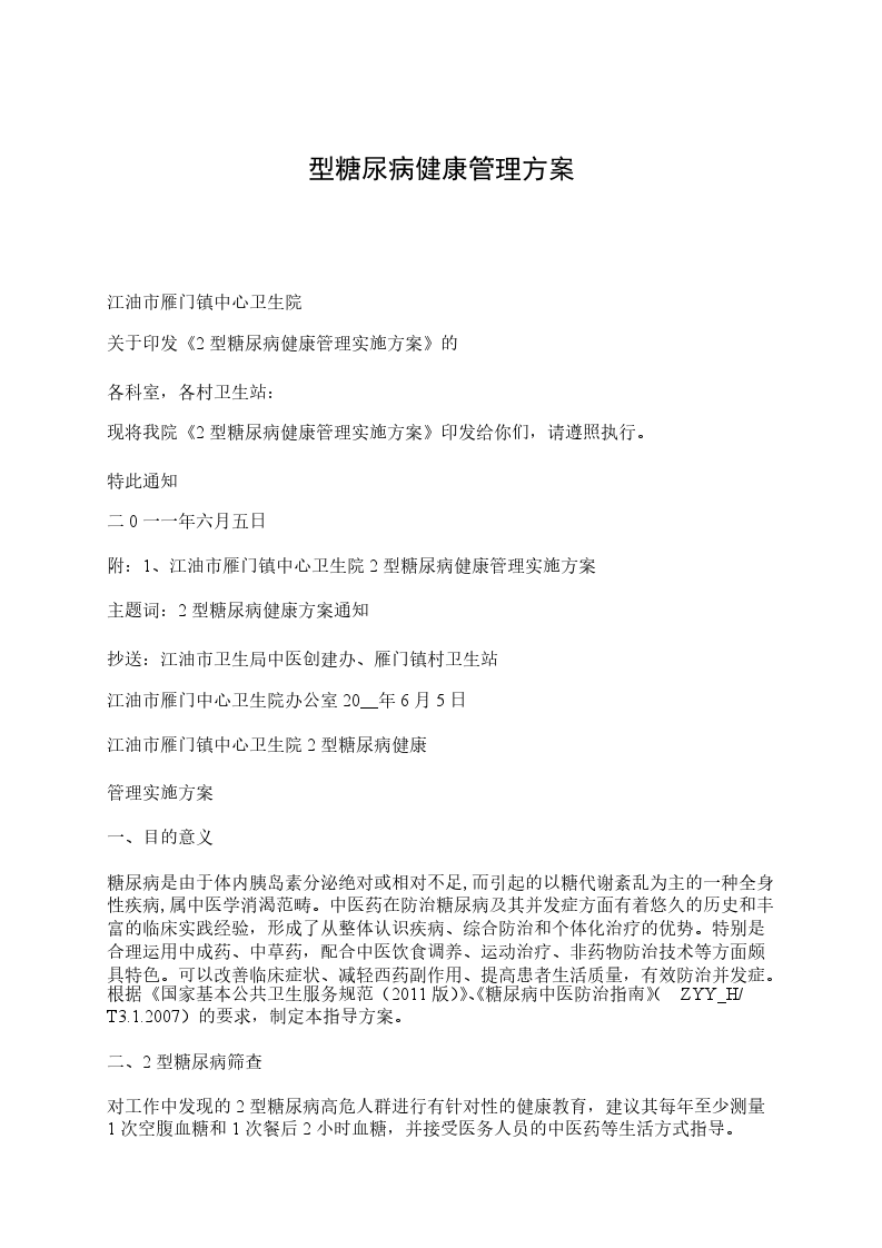 附:1、江油市雁门镇中心卫生院2型糖尿病健康管理实施方案