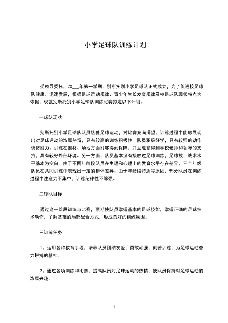 受领导委托,20___年第一学期,别斯托别小学足球队正式成立,为了促进校足球队健康、迅速发展,根据足球运动规律、青少年生长发育规律及校足球队现状特点为依据,现就别斯托别小学足球队训练比赛拟定以下计划。