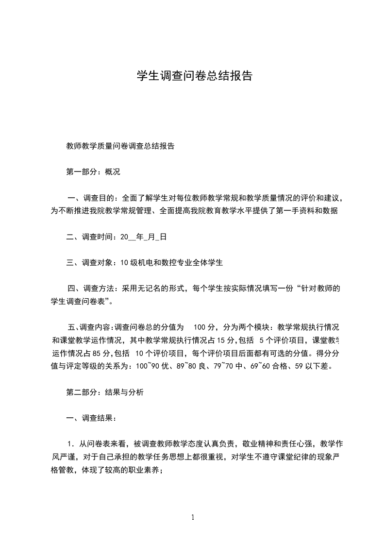 一、调查目的:全面了解学生对每位教师教学常规和教学质量情况的评价和建议,为不断推进我院教学常规管理、全面提高我院教育教学水平提供了第一手资料和数据。