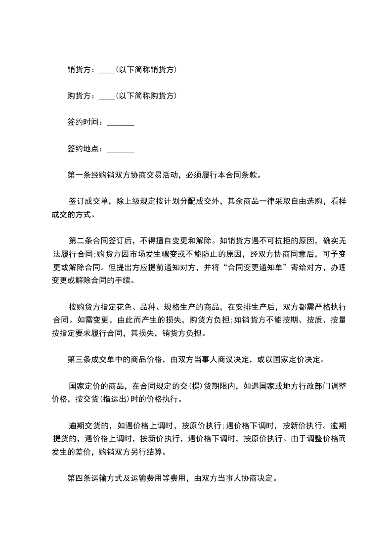 第二条合同签订后,不得擅自变更和解除。如销货方遇不可抗拒的原因,确实无法履行合同;购货方因市场发生骤变或不能防止的原因,经双方协商同意后,可予变更或解除合同。但提出方应提前通知对方,并将“合同变更通知单”寄给对方,办理变更或解除合同的手续。