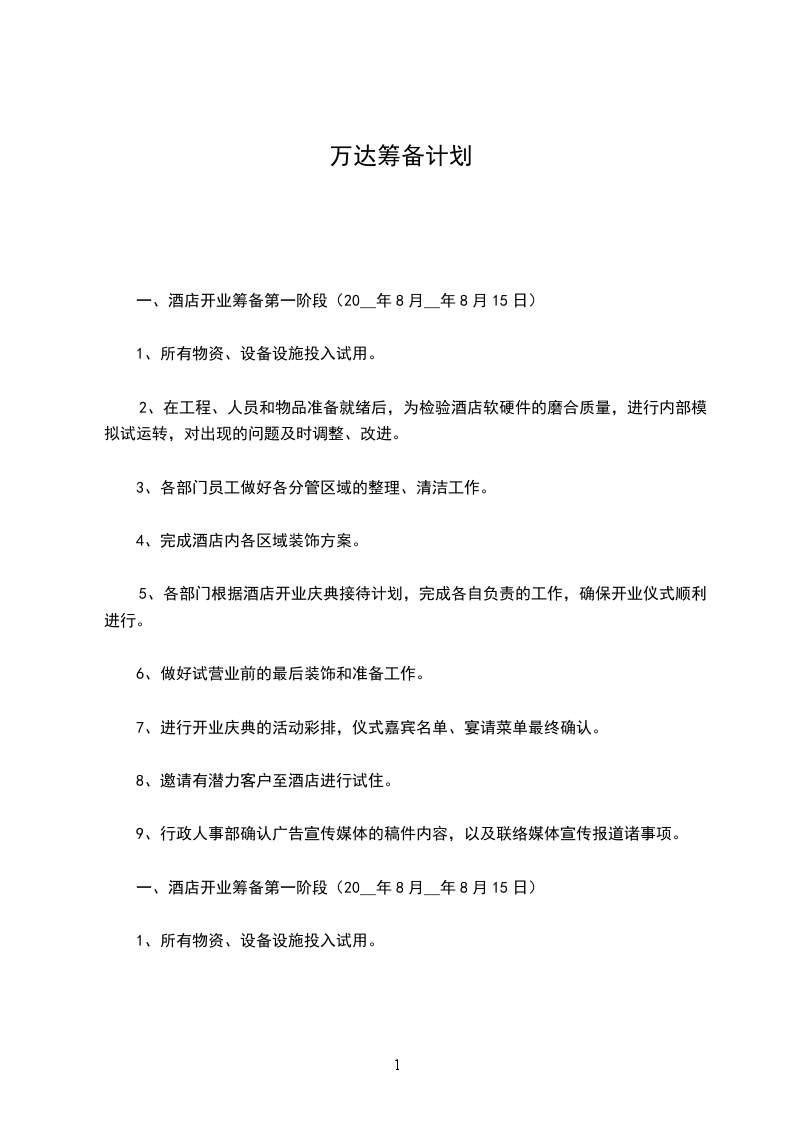 一、酒店开业筹备第一阶段(20__年8月__年8月15日)