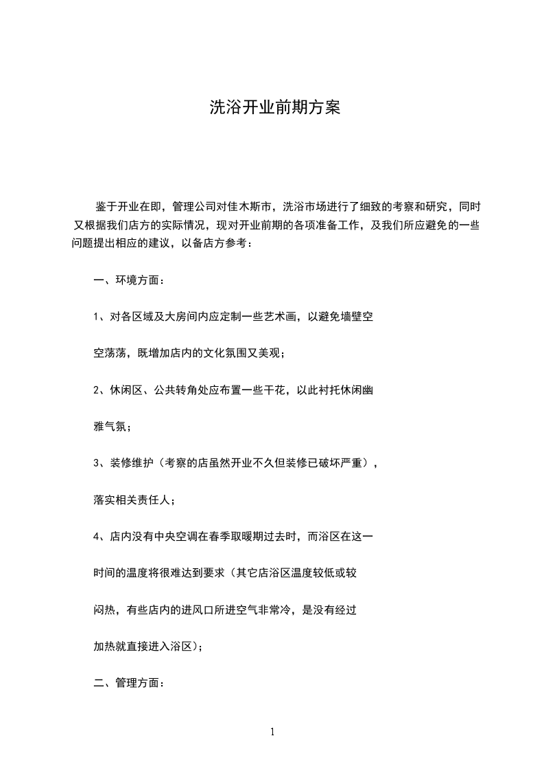 鉴于开业在即,管理公司对佳木斯市,洗浴市场进行了细致的考察和研究,同时又根据我们店方的实际情况,现对开业前期的各项准备工作,及我们所应避免的一些问题提出相应的建议,以备店方参考: