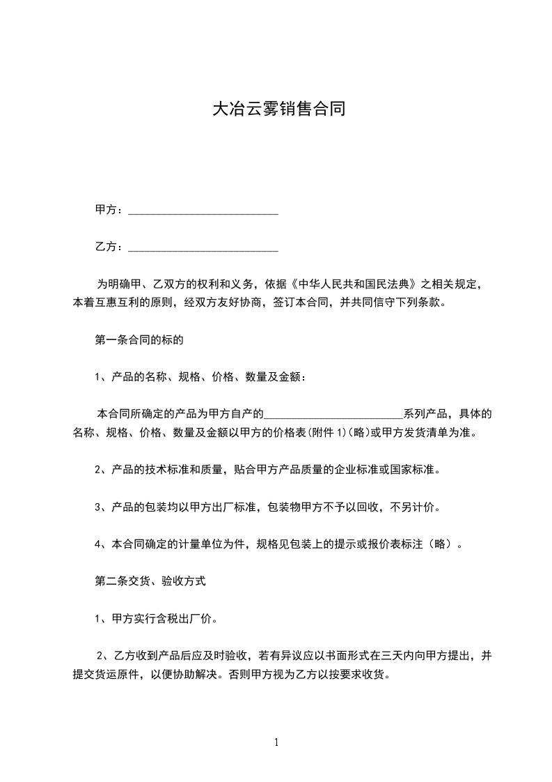 1、本合同所确定的产品为甲方生产的_________________,具体的名称、规格、价格、数量及金额以甲方的价格表或甲方发货清单为准。