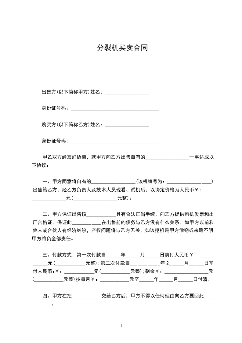 一、甲方同意将自有的__________________(该机编号为:__________________)出售给乙方,经乙方负责人及技术人员现看、试机后,以协定价格为人民币¥:__________________元(__________________元整)。