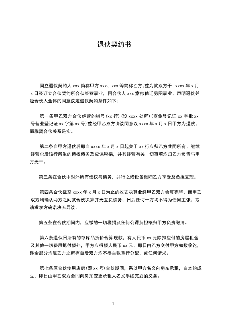 第一条甲乙双方合伙经营的铺号(xx行)(设xxxx处所)(商业登记证xx字批xx号营业登记证xx字第xx号)兹经甲乙双方协议同意以xxx_____年_____月_____日甲方为退伙,而脱离合伙关系是实。