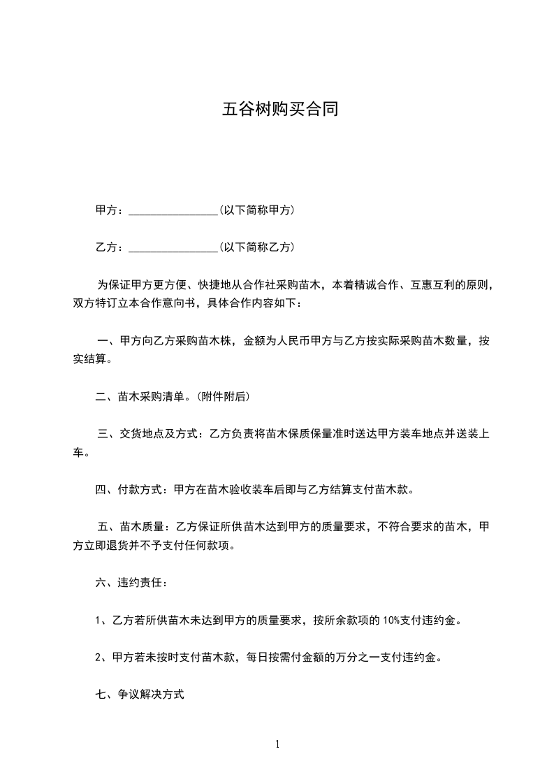 一、甲方向乙方采购苗木_____棵,金额为__________________________________________元整、甲方与乙方按实际采购苗木数量,按实结算。