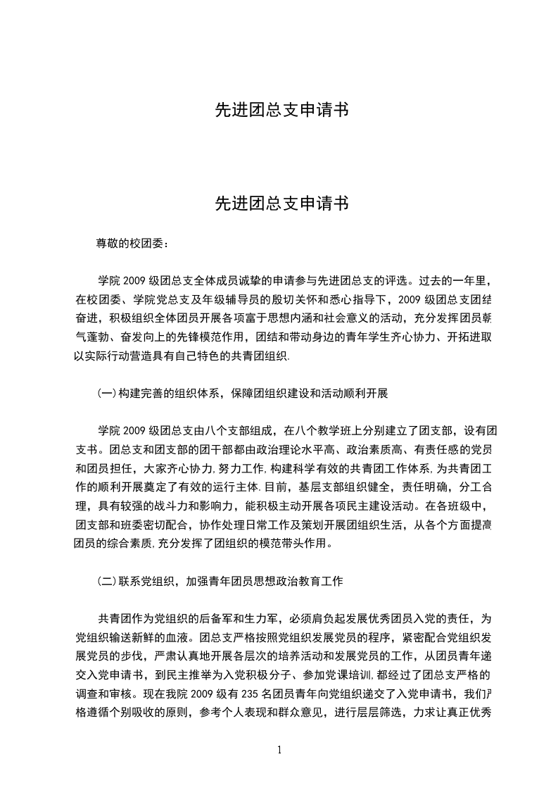 学院2009级团总支全体成员诚挚的申请参与先进团总支的评选。过去的一年里,在校团委、学院党总支及年级辅导员的殷切关怀和悉心指导下,2009级团总支团结奋进,积极组织全体团员开展各项富于思想内涵和社会意义的活动,充分发挥团员朝气蓬勃、奋发向上的先锋模范作用,团结和带动身边的青年学生齐心协力、开拓进取,以实际行动营造具有自己特色的共青团组织.