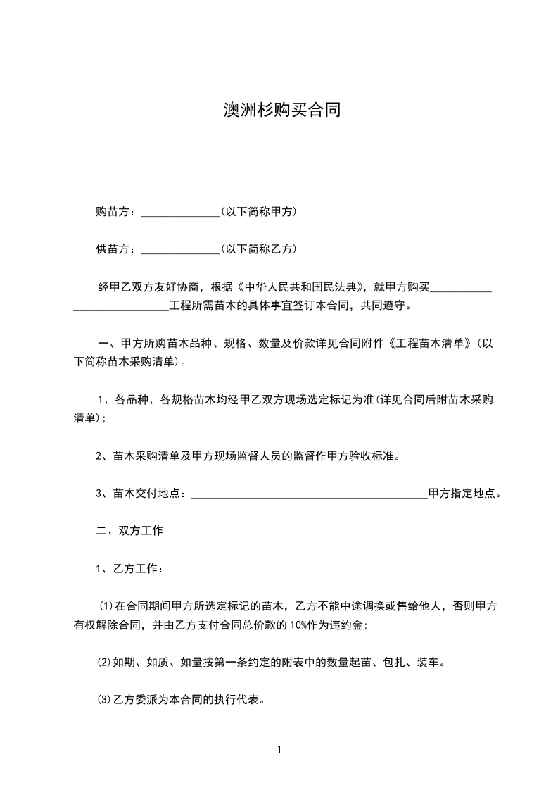 经甲乙双方友好协商,根据《中华人民共和国民法典》,就甲方购买____________________________工程所需苗木的具体事宜签订本合同,共同遵守。