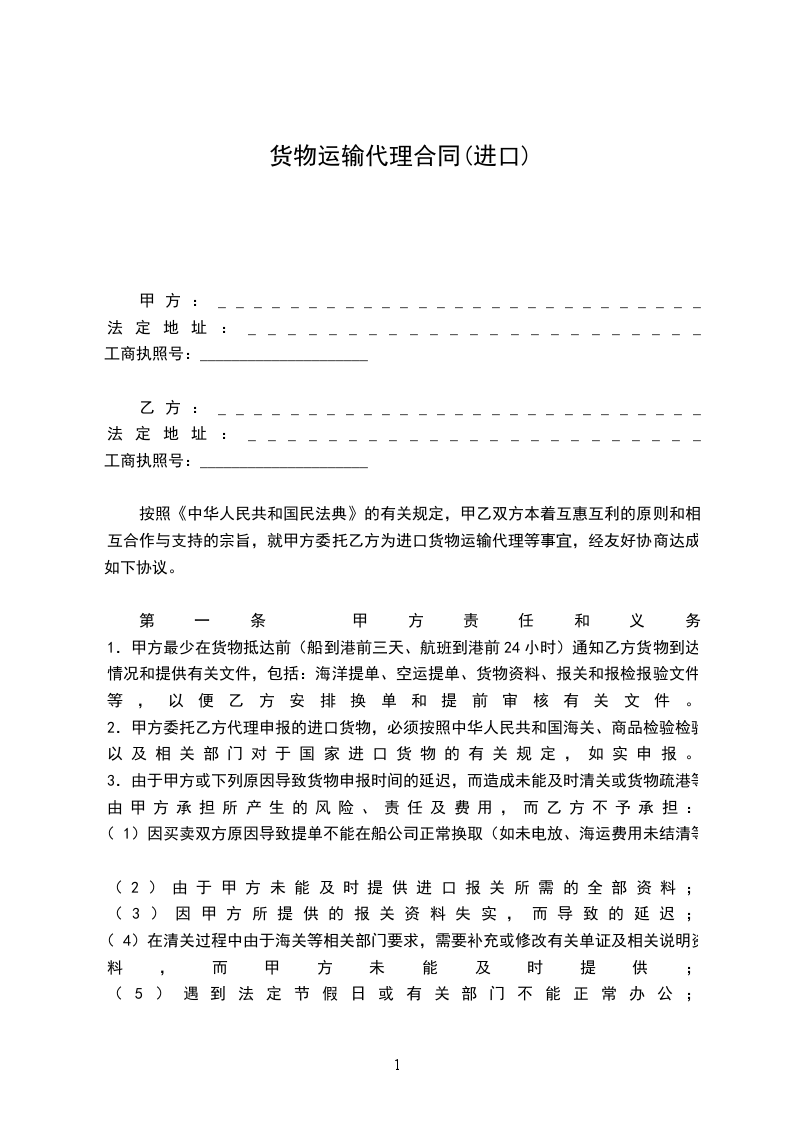 按照《中华人民共和国民法典》的有关规定,甲乙双方本着互惠互利的原则和相互合作与支持的宗旨,就甲方委托乙方为进口货物运输代理等事宜,经友好协商达成如下协议。