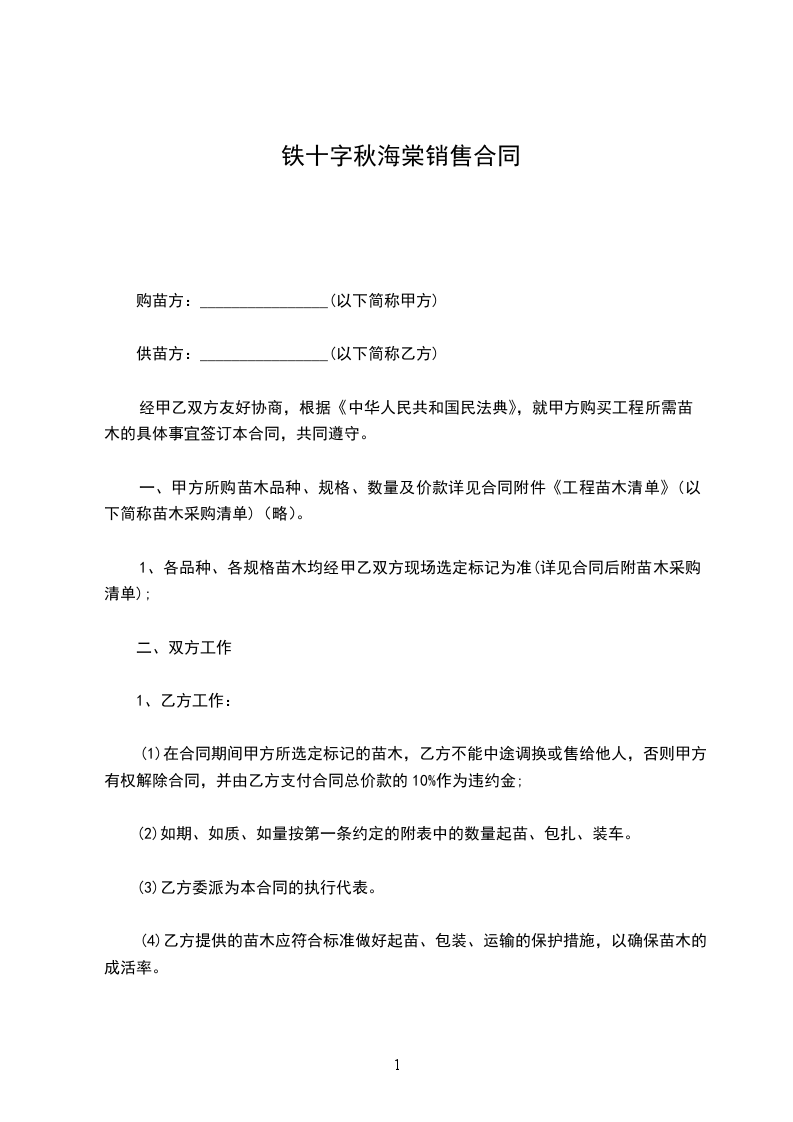 (1)在合同期间甲方所选定标记的苗木,乙方不能中途调换或售给他人,否则甲方有权解除合同,并由乙方支付合同总价款的10%作为违约金;