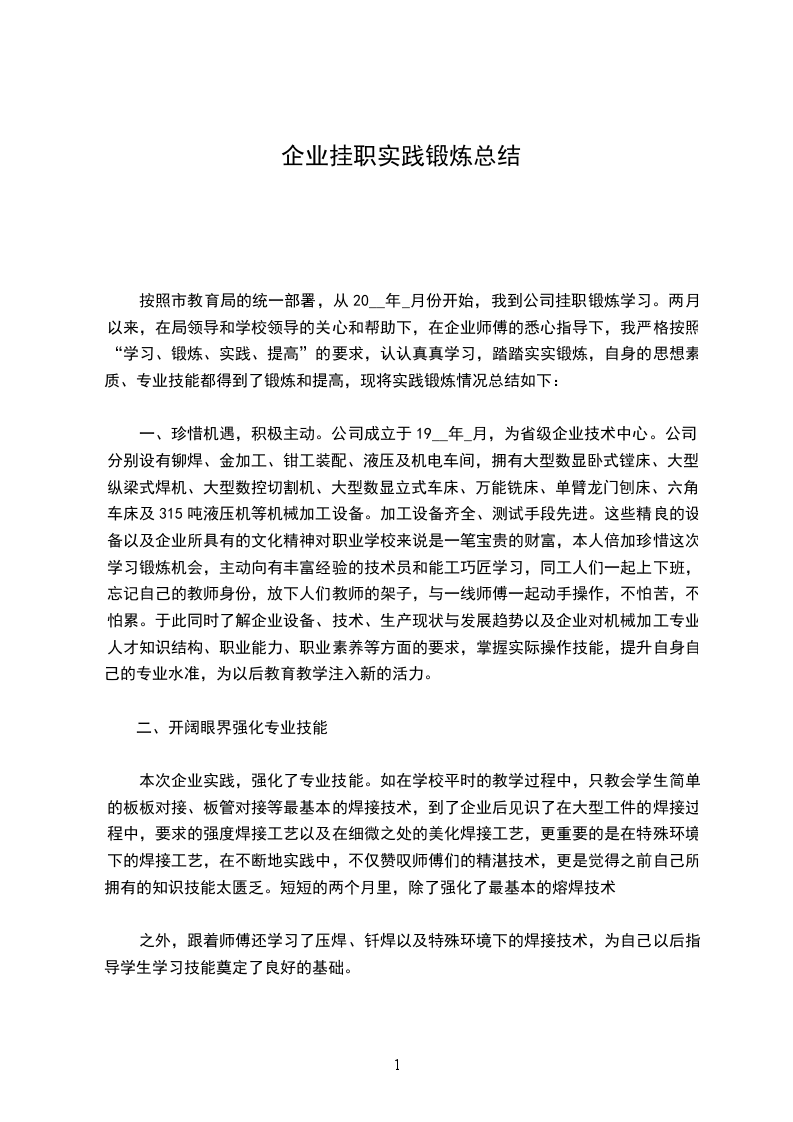 按照市教育局的统一部署,从20__年_月份开始,我到公司挂职锻炼学习。两月以来,在局领导和学校领导的关心和帮助下,在企业师傅的悉心指导下,我严格按照“学习、锻炼、实践、提高”的要求,认认真真学习,踏踏实实锻炼,自身的思想素质、专业技能都得到了锻炼和提高,现将实践锻炼情况总结如下: