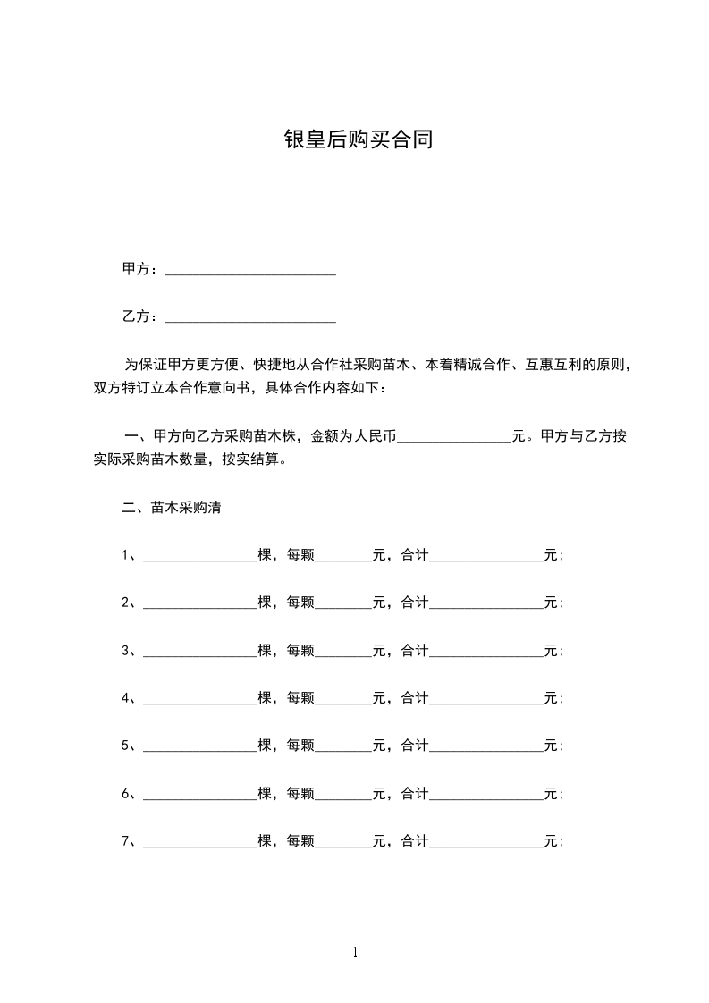 一、甲方向乙方采购苗木株,金额为人民币________________元。甲方与乙方按实际采购苗木数量,按实结算。