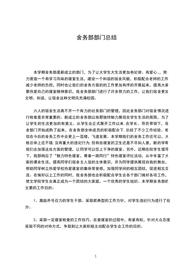 六人的宿舍生活离不开一个有力的社务部门的管理,因此舍务部门对宿舍情况进行检查是非常重要的。新成立的舍务部以他那独特魅力展现在学生生活的周围,为了让学生的生活更加的有意义。从学生会正式展开工作以来,在学长、导员带领下,宿舍部门开始成熟了起来,在舍务部全体成员的积极配合下,总结了不少工作经验。相信在今后的舍务工作中会更上一层楼,飞速发展。本学期我们的舍务工作还可以,大检总体上还不错,没有重大的违纪行为,但有些寝室的卫生还是不尽如人意,新的学期我们会加强这些方面的管理,让同学可以住上干净的寝室。另外,近期在院学生倡导下,我部响应了“魅力特色寝室,青春一路同行”特色寝室评比活动,从中丰富了大家的课余生活,提高同学们宿舍主人翁的主体意识,并为同学提供展现自我的舞台,帮助同学树立热爱学校热爱寝室的集体荣誉感,加强同学间的相互团结,促进相互交流。在做好以上工作的同时,我舍务部也会积极配合学生会各个部门做好各项工作,使文学院学生会真正成为一个团结的大家庭,一个优秀的学生组织。本学期舍务部的主要的工作目的: