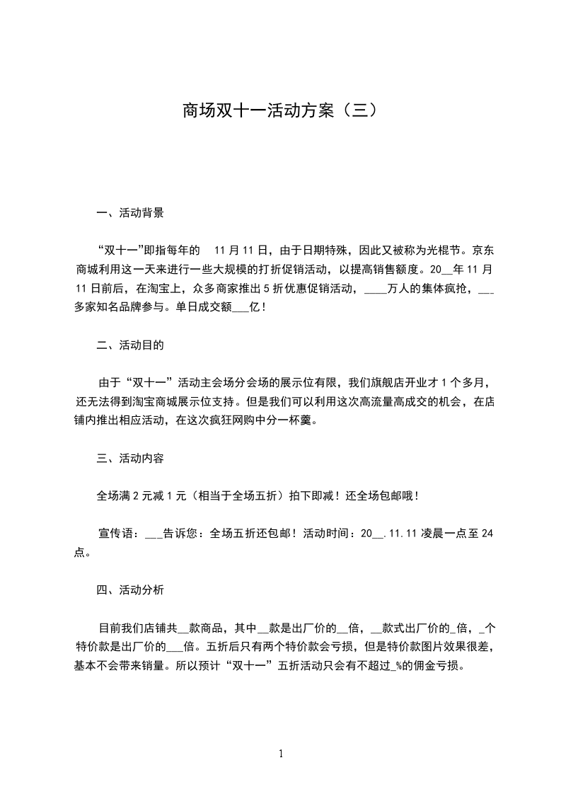 “双十一”即指每年的11月11日,由于日期特殊,因此又被称为光棍节。京东商城利用这一天来进行一些大规模的打折促销活动,以提高销售额度。20__年11月11日前后,在淘宝上,众多商家推出5折优惠促销活动,____万人的集体疯抢,___多家知名品牌参与。单日成交额___亿!