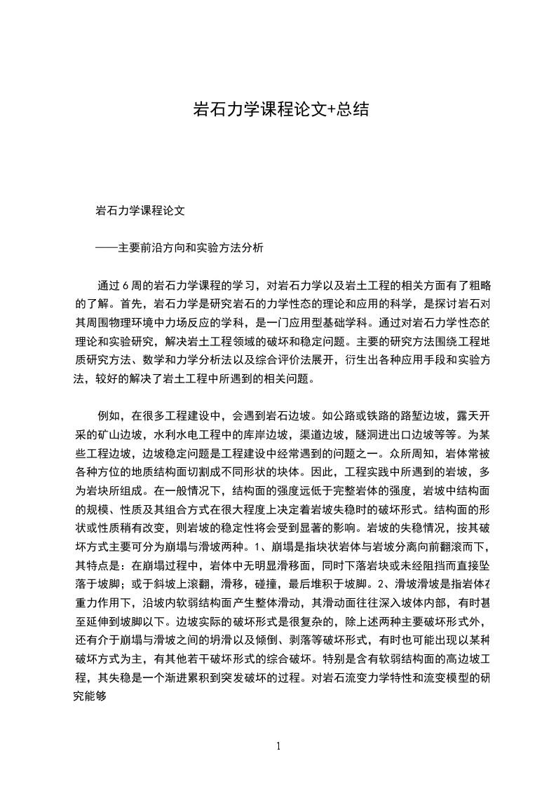 通过6周的岩石力学课程的学习,对岩石力学以及岩土工程的相关方面有了粗略的了解。首先,岩石力学是研究岩石的力学性态的理论和应用的科学,是探讨岩石对其周围物理环境中力场反应的学科,是一门应用型基础学科。通过对岩石力学性态的理论和实验研究,解决岩土工程领域的破坏和稳定问题。主要的研究方法围绕工程地质研究方法、数学和力学分析法以及综合评价法展开,衍生出各种应用手段和实验方法,较好的解决了岩土工程中所遇到的相关问题。