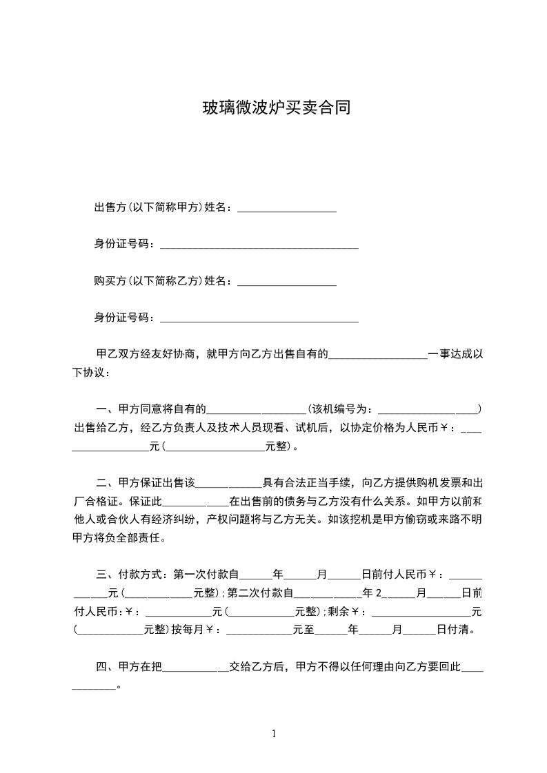 一、甲方同意将自有的__________________(该机编号为:__________________)出售给乙方,经乙方负责人及技术人员现看、试机后,以协定价格为人民币¥:__________________元(__________________元整)。