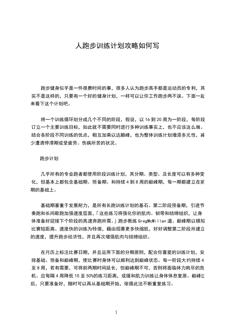 基础期著重于发展耐力,是所有长跑训练计划的基石。第二阶段预备期,引进节奏跑和长间歇跑加强速度层面,「这些练习将强化你的肌肉、韧带和结缔组织,让身体准备好迎接下个阶段的高速奔跑所需。」跑步教练GregMcMillan道。巅峰期以模拟比赛短距离、速度快的训练为特徵,藉由招募更多快缩肌,好好调整第二阶段所建立的速度,提升跑步经济性,并且再次增强肌肉与结缔组织。