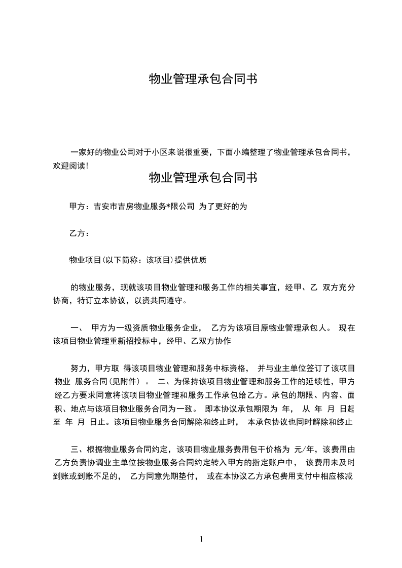 努力,甲方取 得该项目物业管理和服务中标资格, 并与业主单位签订了该项目物业 服务合同(见附件) 。 二、为保持该项目物业管理和服务工作的延续性,甲方经乙方要求同意将该项目物业管理和服务工作承包给乙方。承包的期限、内容、面 积、地点与该项目物业服务合同为一致。 即本协议承包期限为 年, 从 年 月 日起至 年 月 日止。该项目物业服务合同解除和终止时, 本承包协议也同时解除和终止。